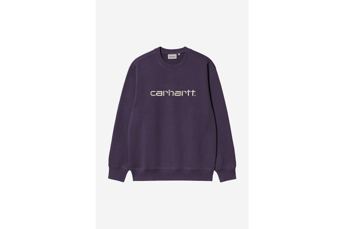The Carhartt Sweatshirt is made in a loose fit from heavyweight cotton-poly jersey fabric, which has been brushed for a fleece-like backing. It also features a ribbed collar, hem and cuffs. An embroidered Script Logo appears across the chest.